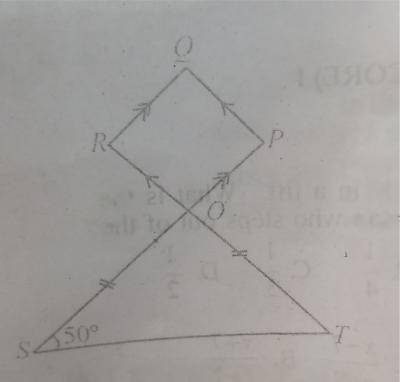 In the diagram, POS and ROT are straight lines. OPQR is a parallelogram, |OS| = |OT| and ∠OST = 50°. Calculate the value of ∠OPQ.