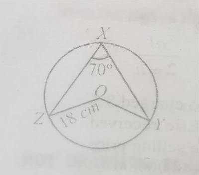 In the diagram, O is the centre of the circle of radius 18cm. If < zxy = 70\(^o\), calculate the length of arc ZY. [Take \(\pi = \frac{22}{7}\)]