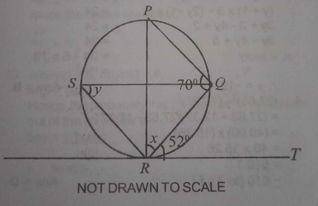 In the diagram, RT is a tangent to the circle at R, < PQR = 70\(^o\), < QRT = 52\(^o\), < QSR and < PRQ = x. Find the value of y.