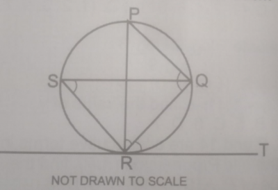 In the diagram, RT is a tangent to the circle at R, < PQR = 70\(^o\), < QRT = 52\(^o\), < QSR and < PRQ = x. Calculate the value of x.