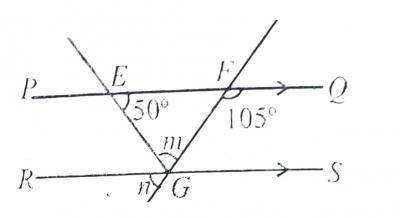 In the diagram, PQ is parallel to RS, < QFG = 105\(^o\) and < FEG = 50\(^o\). Find the value of n