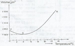 The graph above shows the expansion of water as the temperature increases from 0oC. Which of the following deductions from the graph are true? i. Water has its maximum density at Q. ii. The volume of water is greater at 0oC than at 4oC. iii. The volume of water decreases uniformly when cooled from 100oC. iv. When water solidifies, its volume increases