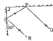 Two mirrors are inclined as shown in the diagram. A ray of light RO strikes the arrangement at O and emerges along PO. The emergent ray has been deviated through