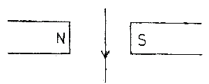 The diagram above shows a current carrying wire between the poles of a magnet. In which direction would the wire tend to move?