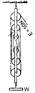 The diagram represents a block-and-tackle pulley system on which an effort of 50N is just able to lift a load of weight W. If the efficiency of the machine is 40%. find the value of W