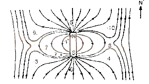 The diagram above shows the magnetic field around a bar magnet which has its N-pole pointing north. The neutral points in the field are likely to occur at