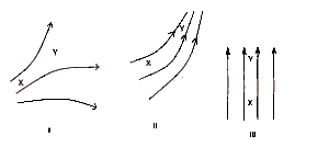 The diagrams above show lines of force in electric fields. In which of the diagrams would a positive test charge experience the least force as it moves from x to y?