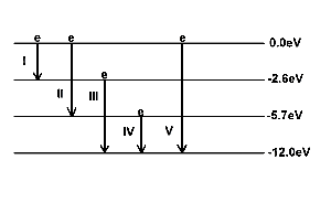 The diagram above illustrates the energy transitions of five electrons of an atom. Which of the transitions will produce the emission of longest wavelength?