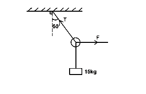 A 15kg mass, suspended from a ceiling, is pulled aside with a horizontal force, F, as shown in the diagram above. Calculate the value of the tension, T. (g = 10ms-2)