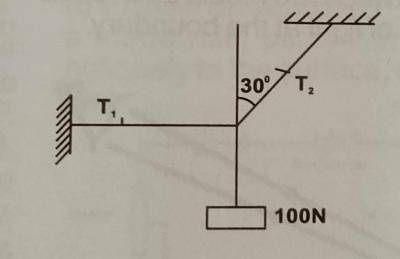 The diagram above illustrates three forces T\(_1\), T\(_2\) and 100N in equilibrium. Determine the magnitude of T\(_1\).