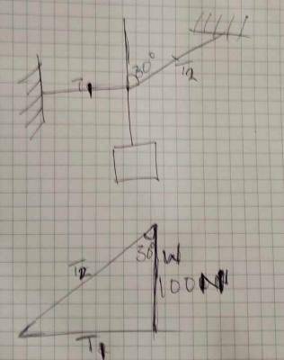 The diagram above illustrates three forces T\(_1\), T\(_2\) and 100N in equilibrium. Determine the magnitude of T\(_1\).