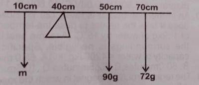 A uniform metre rule of mass 90g is provided at the 40cm mark. If the rule is in equilibrium with an unknown mass m placed at the 10cm mark and a 72g mass at the 70cm mark, determine m