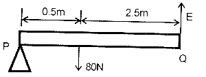 a beam PQ pivoted at P carries a load of 80N as shown above. Calculate the effort E, required to keep it horizontal. [neglect the weight of the beam]