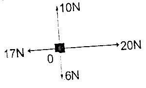 Four co-planar forces of magnitudes 10N, 17N, 6N and 20N act at point O as shown in the above diagram. Determine the magnitude of the resultant force