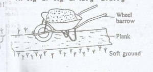 A plank is placed along the path on which a wheel barrow containing sand is pushed at a construction site to prevent it from sticking as illustrated in the diagram given. The large area of the plank prevents the wheel barrow from getting stuck by