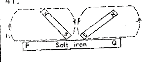 Two magnets are used to magnetize a soft iron bar PQ as illustrated in the diagram given. The correct polarity at P and Q respectively