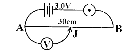 A battery of e.m.f 3.0V is connected across a potentiometer wire AB of length 10\(\Omega m^{-1}\) as illustrated in the diagram above. If the jockey J makes contact at the 30cm mark, determine the resistance of length AJ and voltage across AJ.