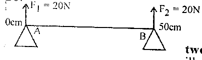 A bar AB is balanced horizontally on two knife edges as illustrated as in the diagram above. Determine the weight of the bar.
