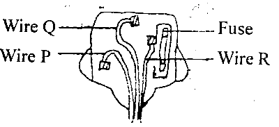 The diagram above illustrates the wire connections to a three-pin plug. The wires P, Q and R respectively are: