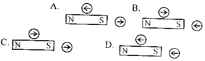 A student uses two compass needles to investigate the magnetic field around a bar magnet. Which of the following diagrams show the correct directions of the needles?